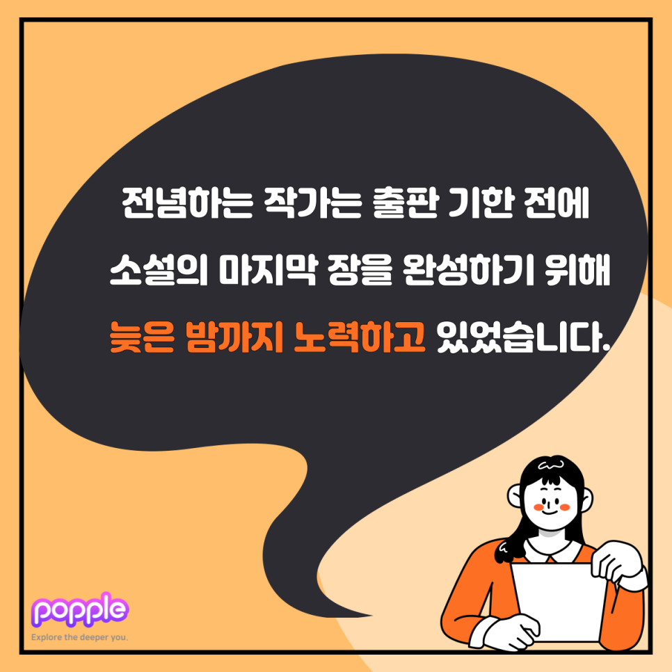 A. 프로젝트 마감 기한이 점점 다가오자, 팀은 시간 내에 작업을 완료하기 위해 늦은 밤까지 야근을 하기로 결정했습니다.