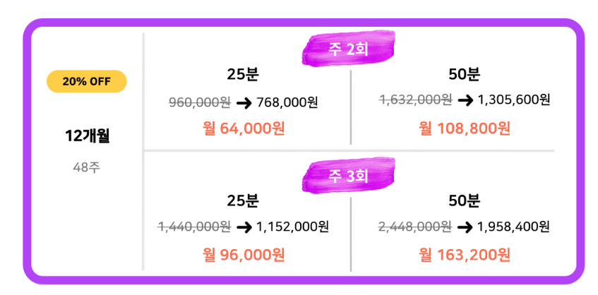 25분 수업 기준 월 8만원이라는 가성비 좋은 가격까지