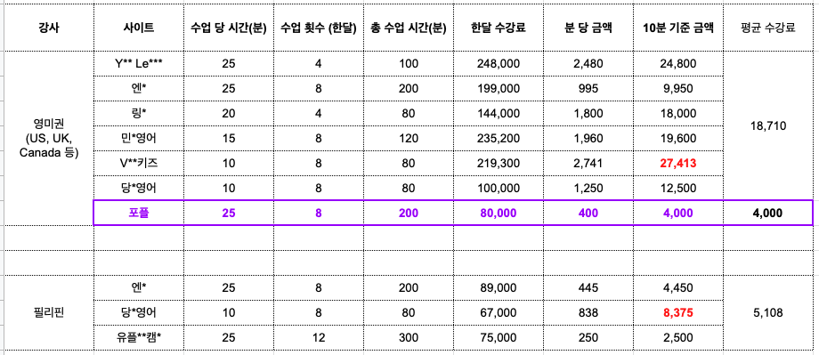 포플처럼 영미권의 10분당 평균 수강료는 18,710원이에요.